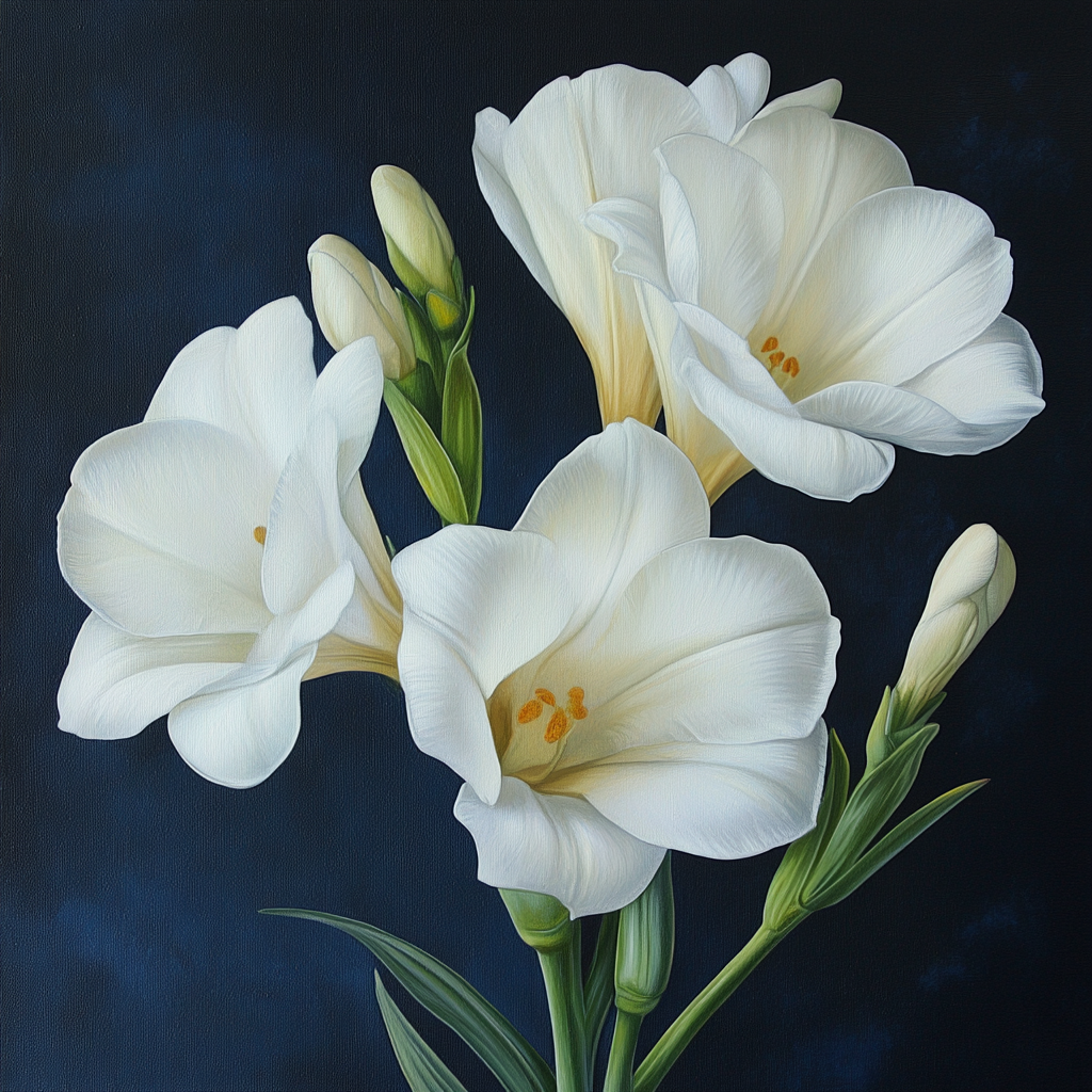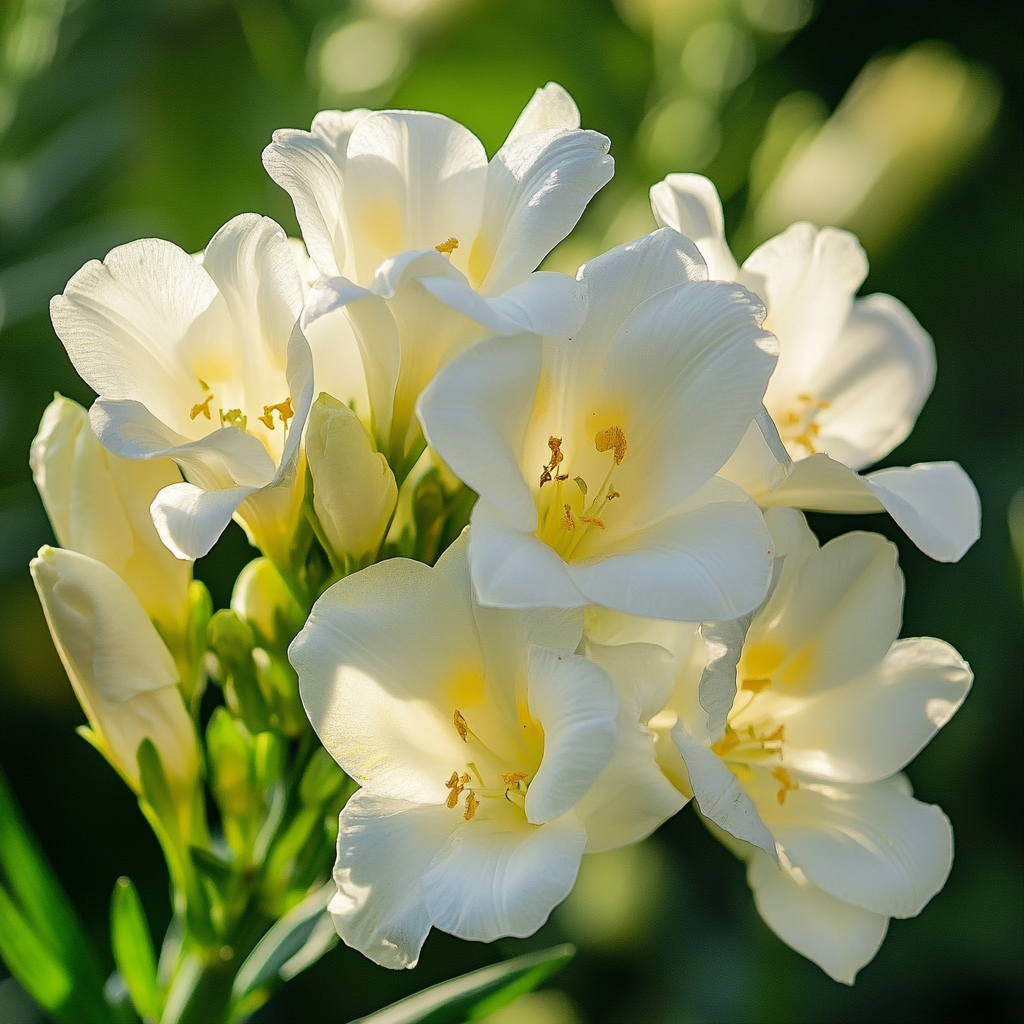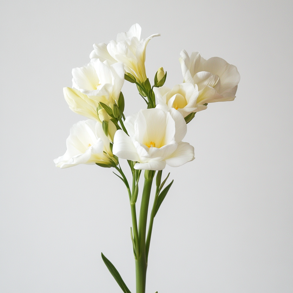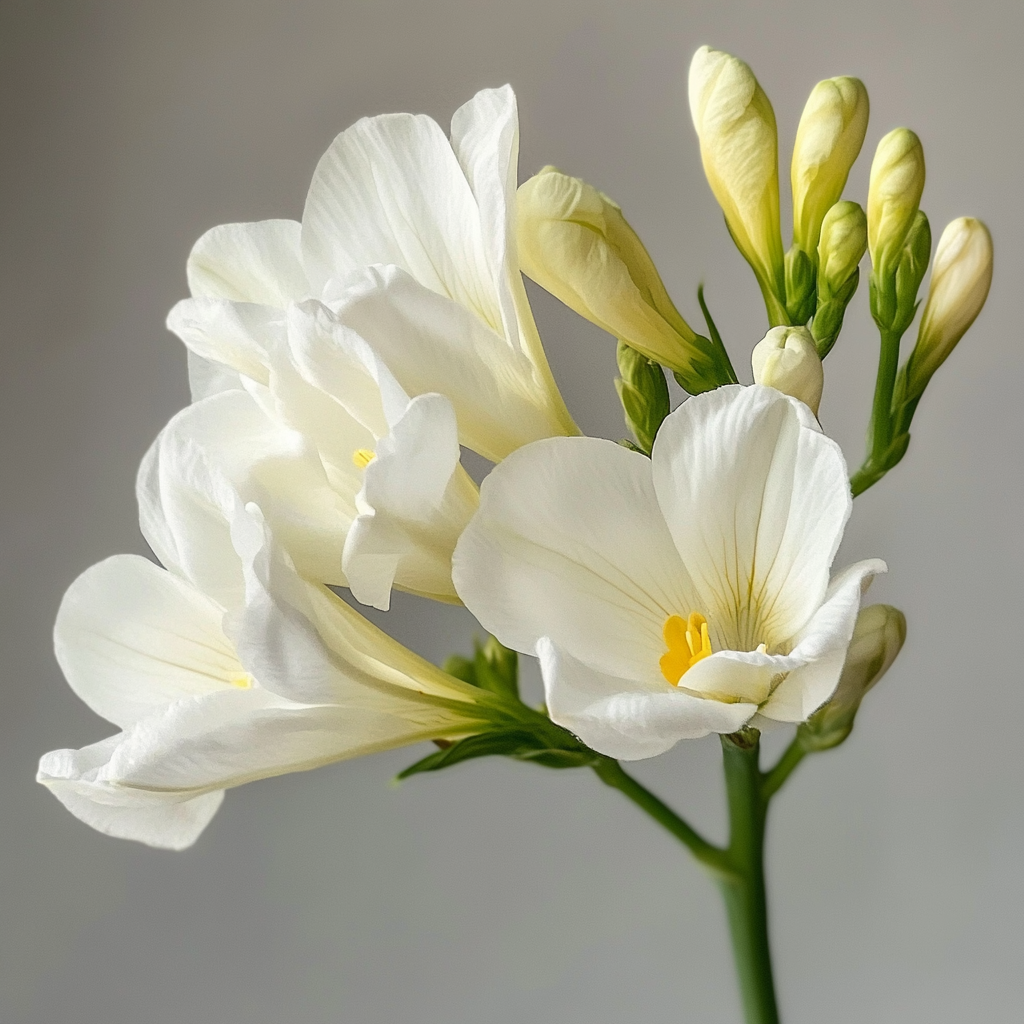 흰 프리지아는 "순수"와 "무결"을 상징하며, 그 청초한 이미지로 인해 결혼식이나 신부 부케로 자주 사용됩니다. 이 꽃은 진심 어린 마음을 전달하기에 적합하며, 존경과 감사를 표현하는 데 유용합니다.