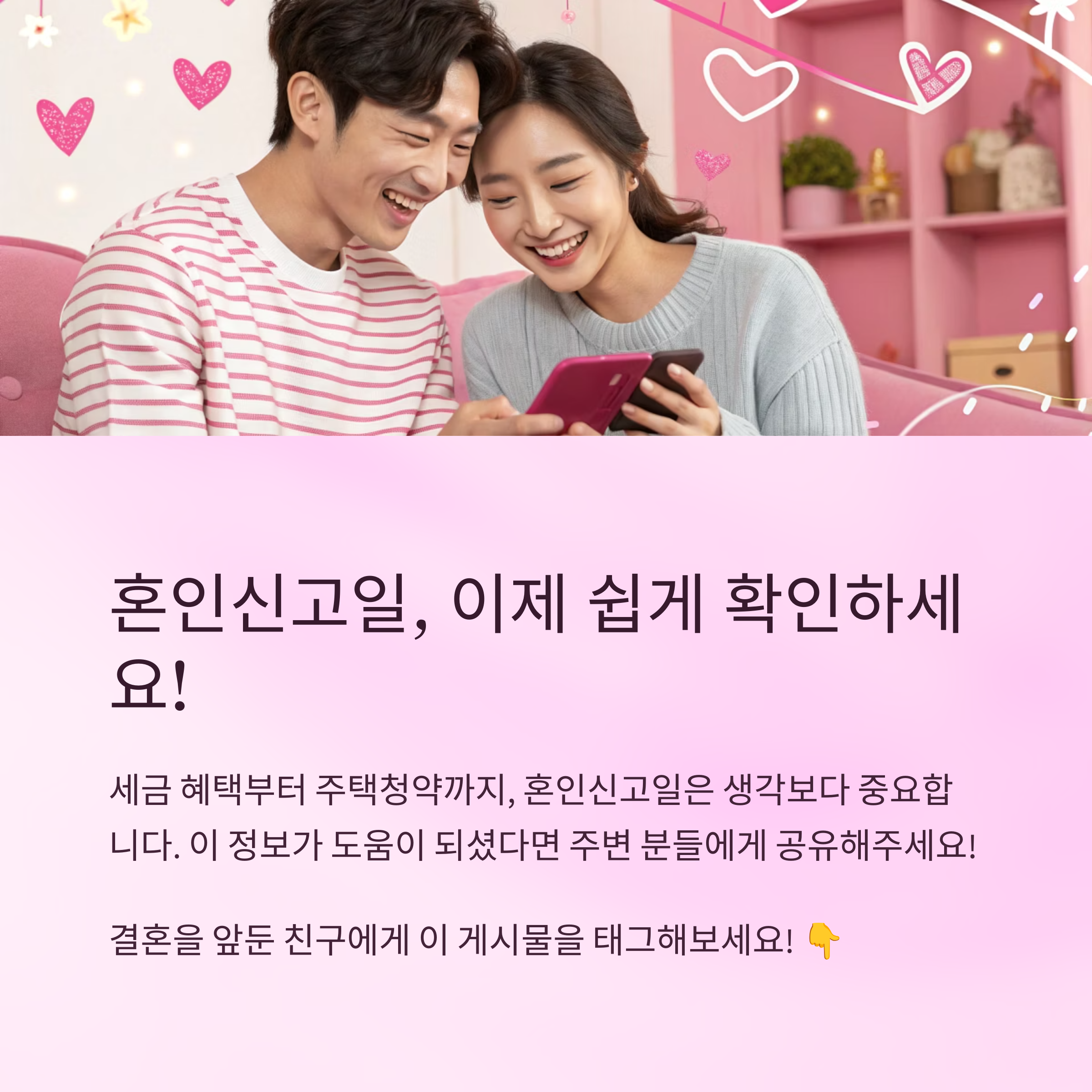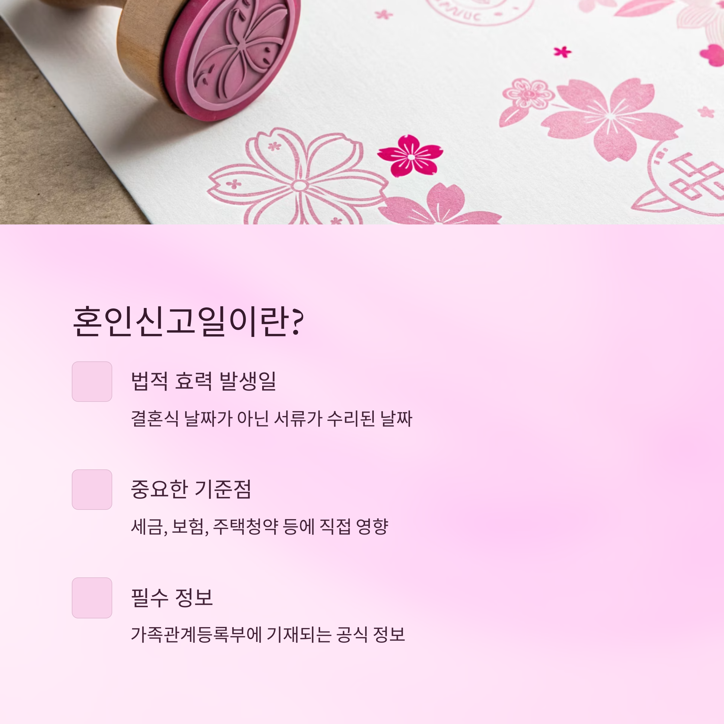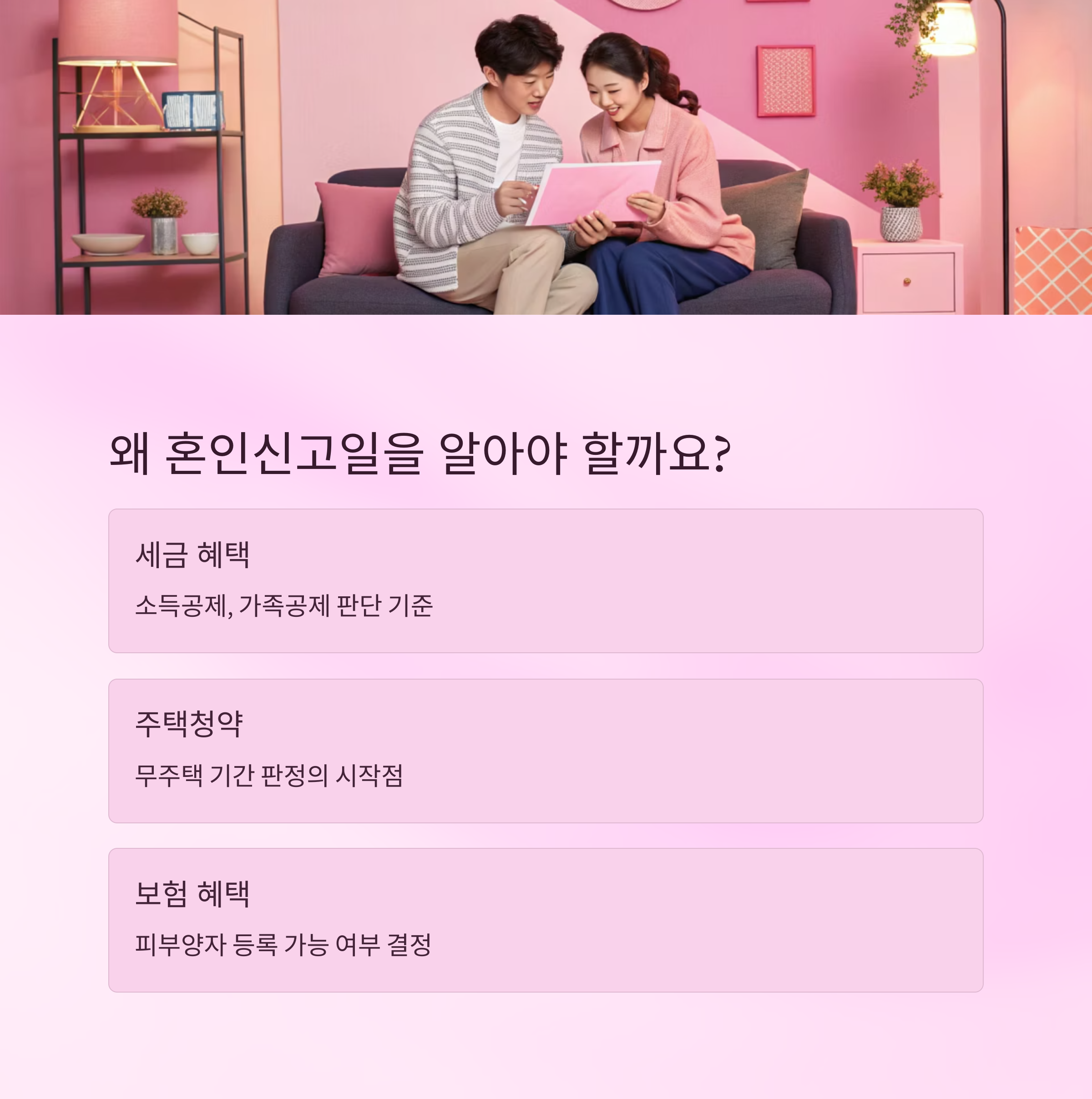 혼인신고일은 법적으로 부부가 된 날짜이므로, 이 날짜 이후에는 여러 가지 제도적인 권리와 의무가 발생하게 돼요. 예를 들어 소득공제, 건강보험, 주거복지 혜택, 청약 가점 등등 가족 단위로 제공되는 행정 서비스에서는 신고일을 기준으로 판단하거든요.