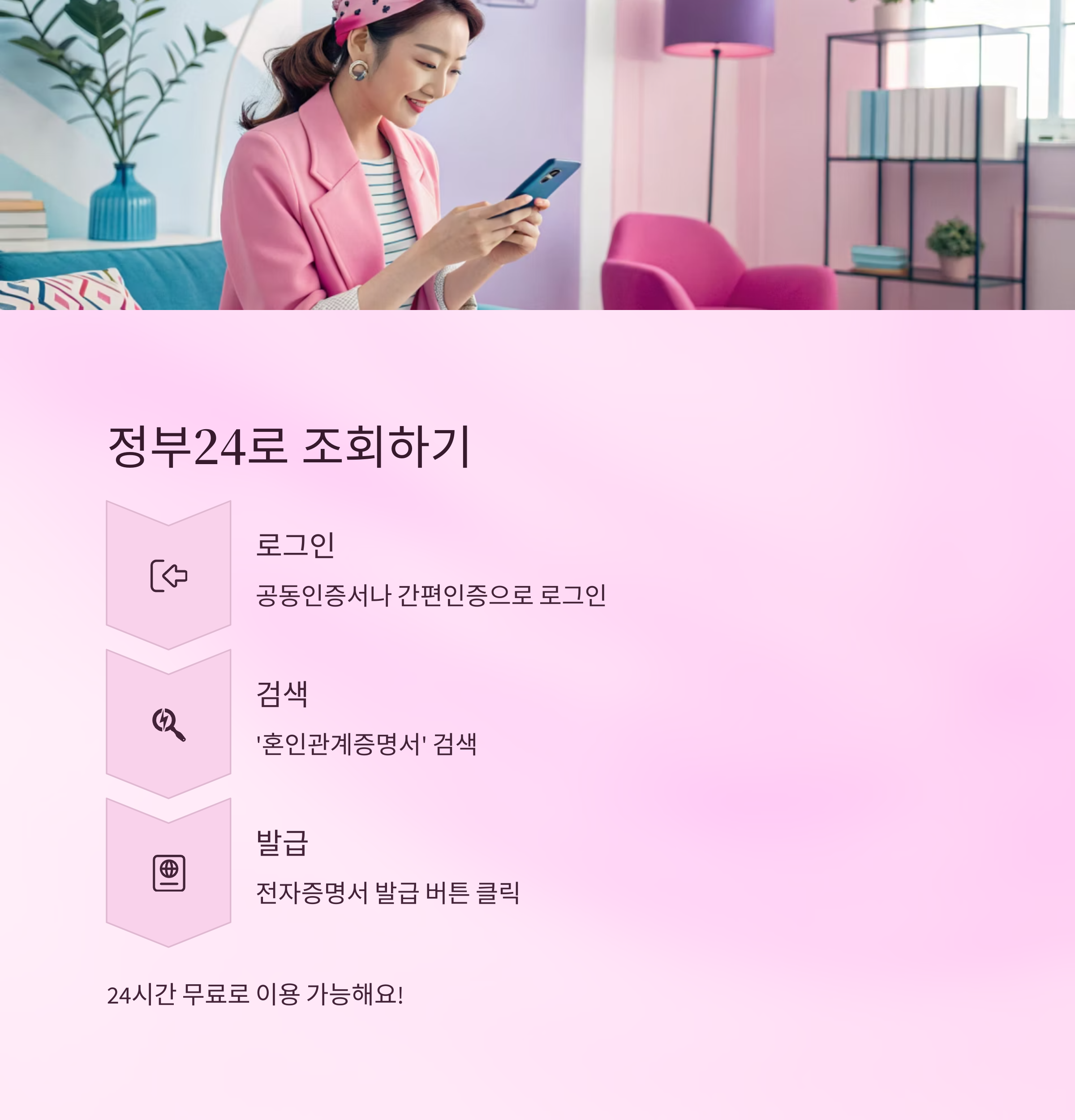 정부24는 행정안전부에서 운영하는 온라인 민원 포털로, 가족관계증명서나 혼인관계증명서를 집에서 바로 출력할 수 있어요. 혼인신고일도 이 증명서 내에 표기되어 있답니다.