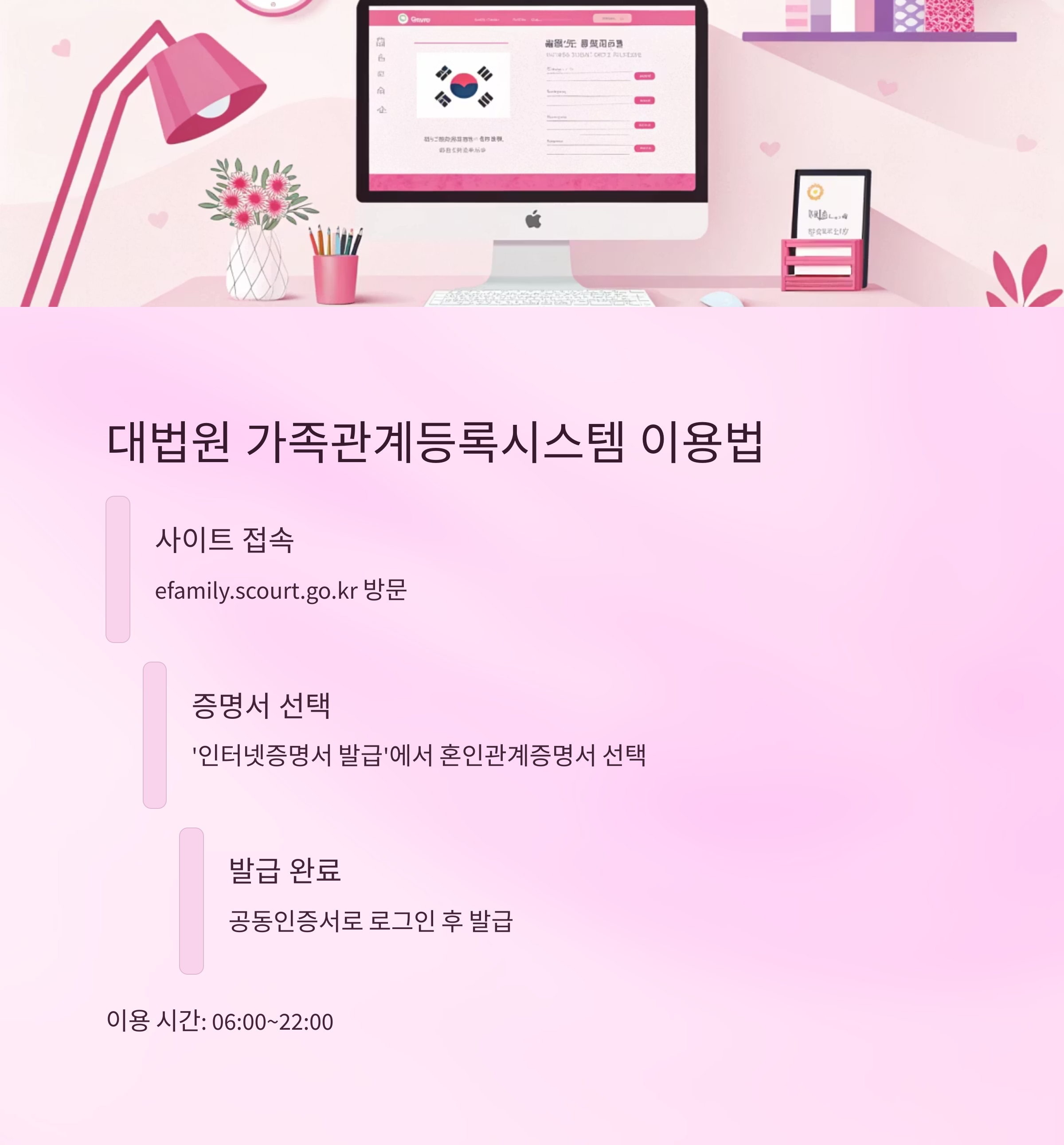 정부24 외에도 대법원에서 운영하는 '가족관계등록시스템(efamily.scourt.go.kr)'에서도 확인이 가능해요. 이곳은 가족관계에 관한 다양한 증명서를 발급받을 수 있는 전문 시스템이에요.