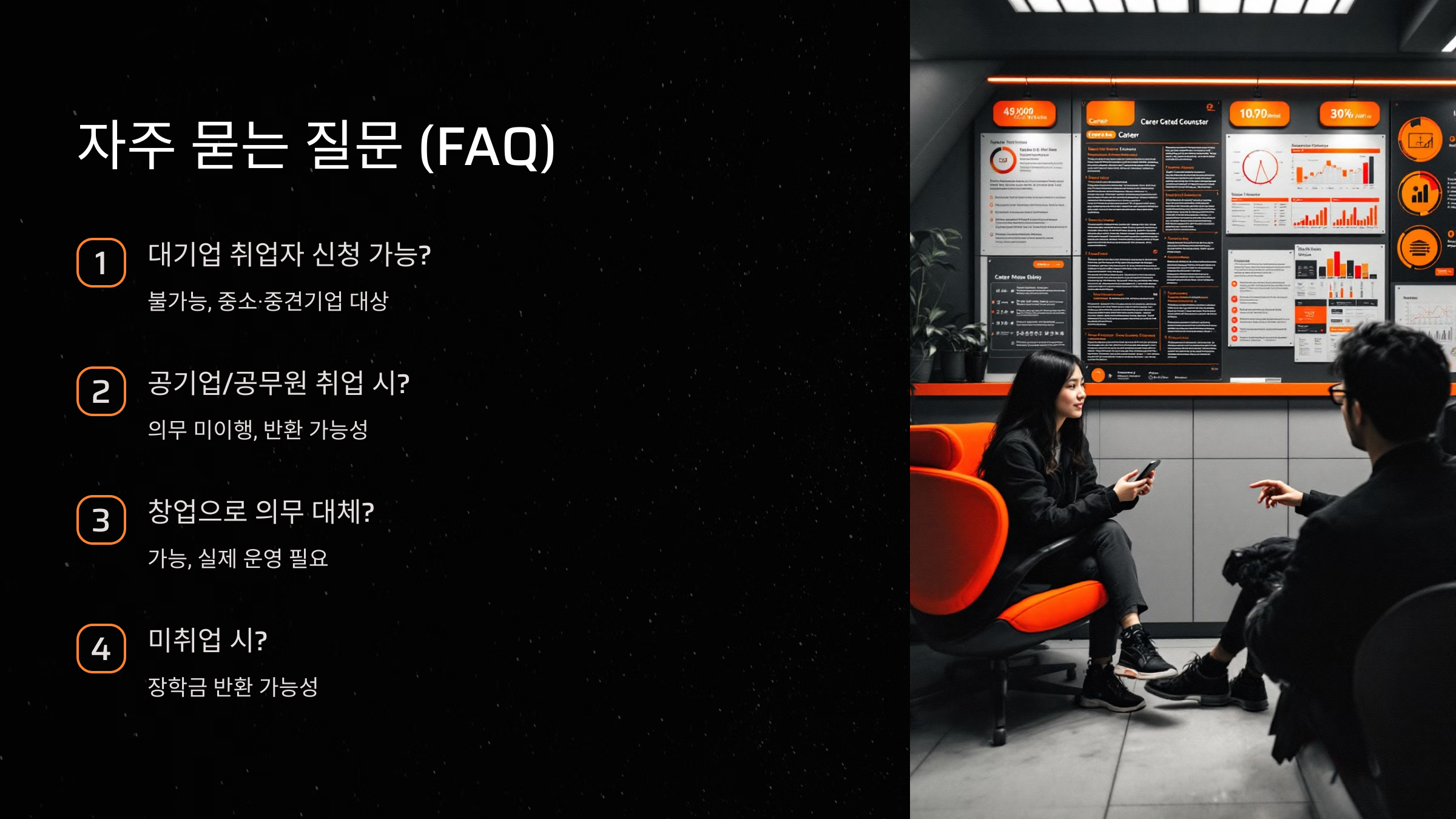 하지만 의무 사항도 반드시 지켜야 해요. 취업연계 장학금(Ⅰ유형)은 수혜 학기 × 6개월 동안 중소기업 근무나 창업 상태를 유지해야 하고, 후학습자 장학금(Ⅱ유형)은 수혜 학기당 4개월간 재직을 유지해야 해요.