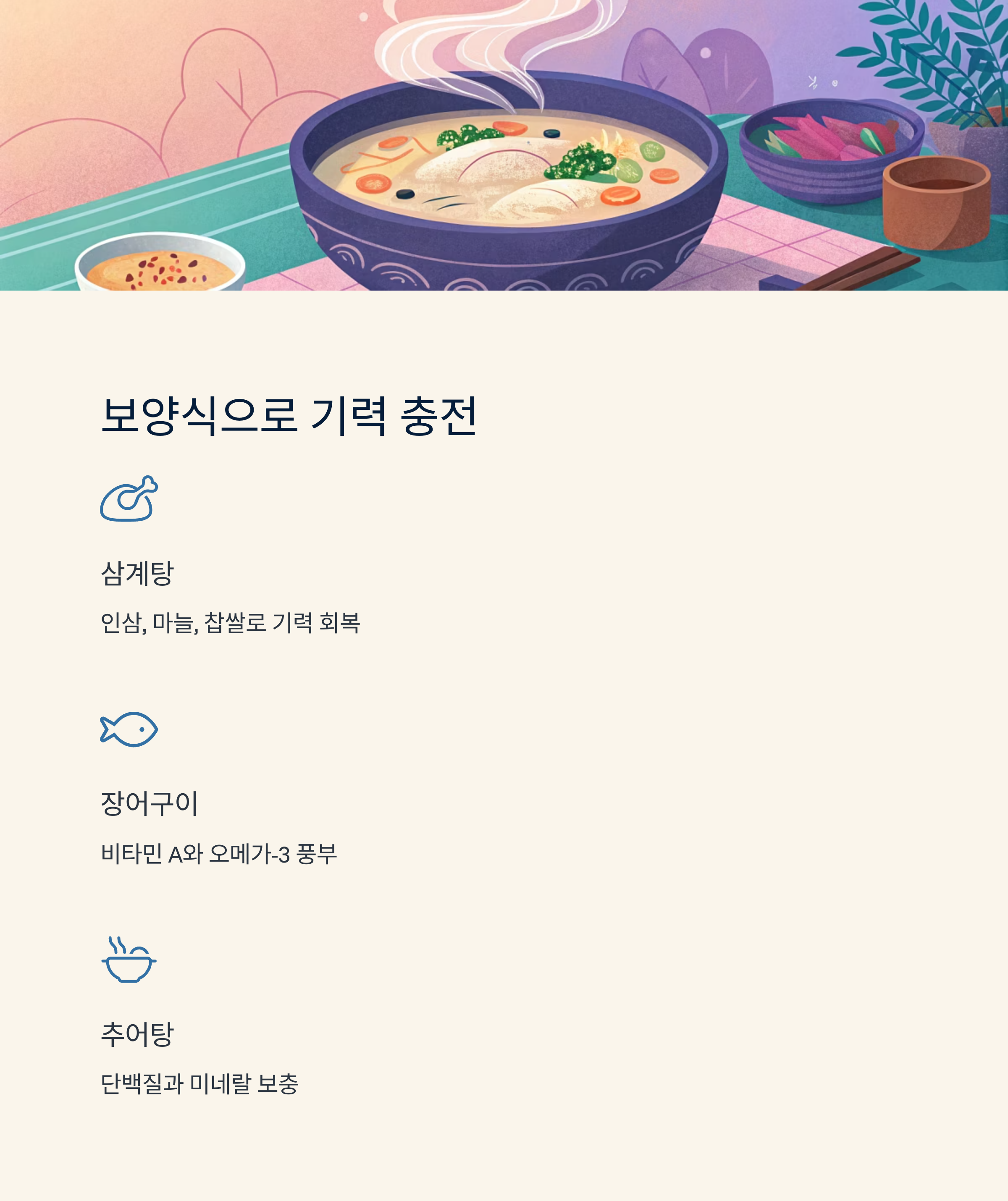 복날 하면 제일 먼저 떠오르는 음식은 역시 삼계탕이에요. 인삼, 마늘, 찹쌀, 대추가 들어간 삼계탕은 기력 회복에 딱 좋아요. 닭고기의 단백질과 한방 재료의 영양이 더해져 무더위에 지친 몸에 활력을 줘요.