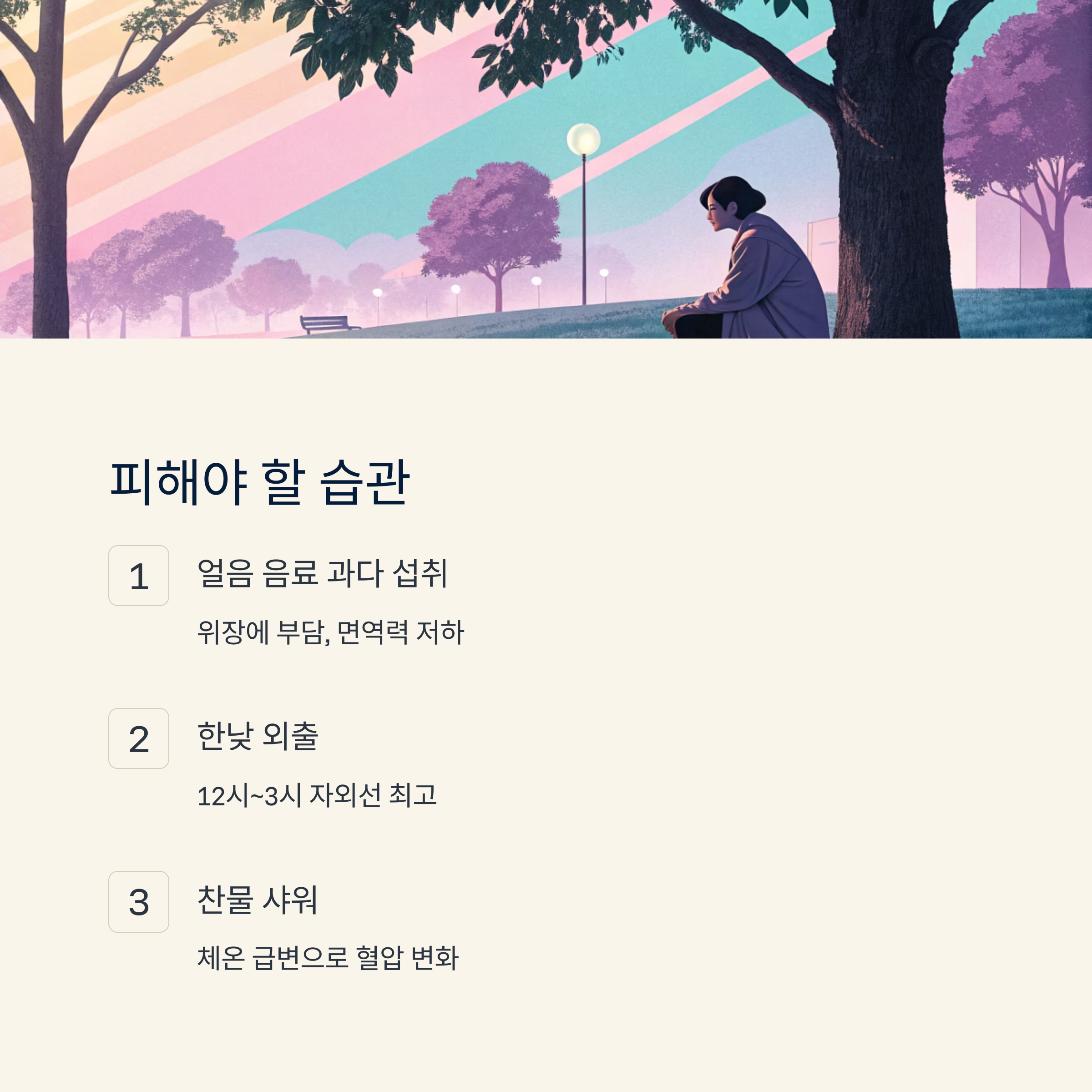 갑작스러운 찬물 샤워도 조심해야 해요. 더운 날씨에 땀이 많이 나기 때문에 차가운 물로 샤워하고 싶겠지만, 체온 변화로 인해 혈압이 급격히 떨어질 수 있거든요. 미지근한 물로 샤워하거나 족욕을 하는 것이 훨씬 안전해요.