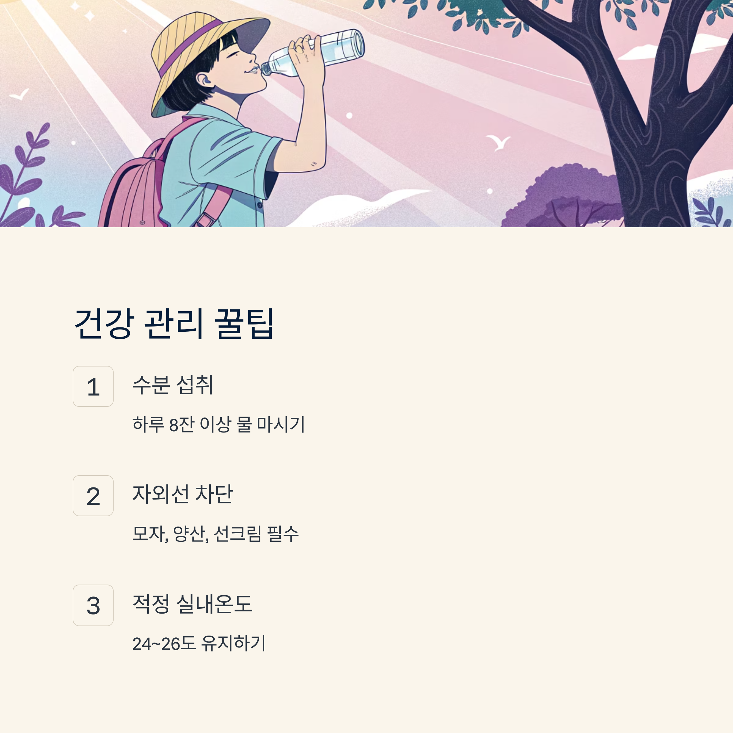 또한 햇볕이 강한 시간대인 낮 12시에서 오후 3시 사이 야외활동은 피하는 것이 좋아요. 이 시간에는 자외선 지수가 가장 높아 탈수와 일사병 위험이 높아요. 꼭 외출이 필요하다면 선글라스, 모자, 자외선 차단제를 꼭 챙겨야 해요.