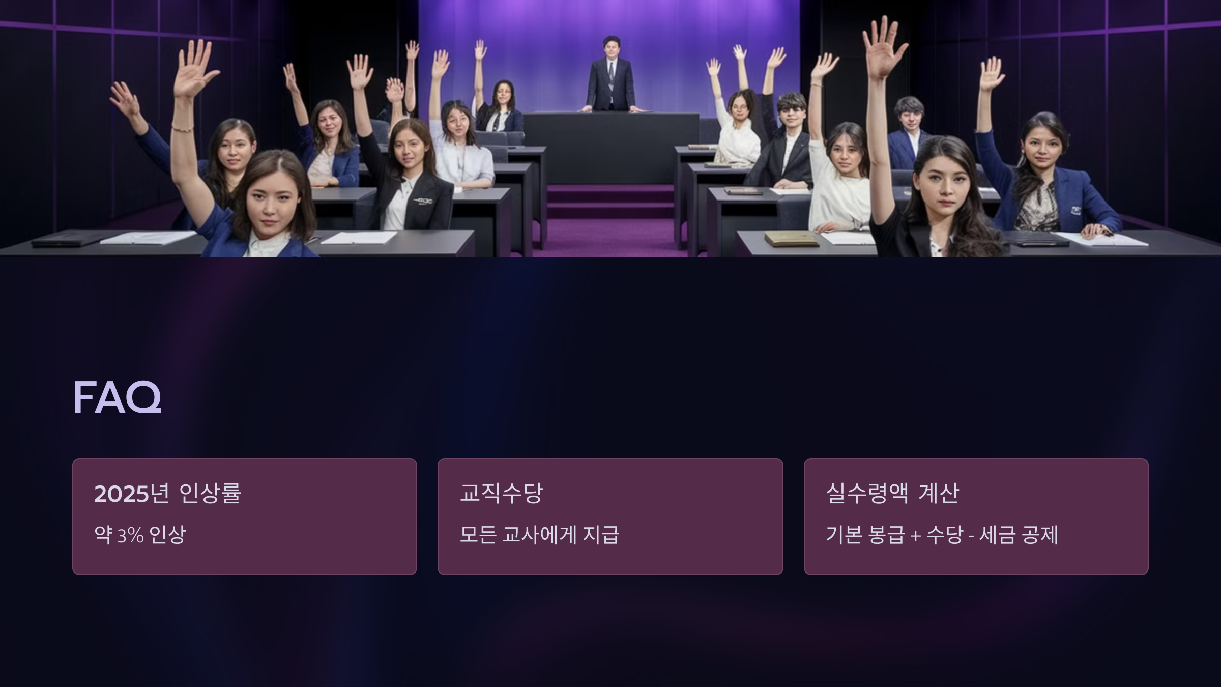 교사들의 급여는 기본 봉급과 각종 수당으로 구성돼 있어요. 기본 봉급은 교사 개개인의 호봉에 따라 지급되며, 추가적으로 교직수당, 담임교사 수당, 정근수당, 가족수당 등 여러 가지 수당이 지급되죠. 이번 글에서는 2025년 교사 호봉표와 함께 실수령액 계산법까지 상세히 알려드릴게요! 📚