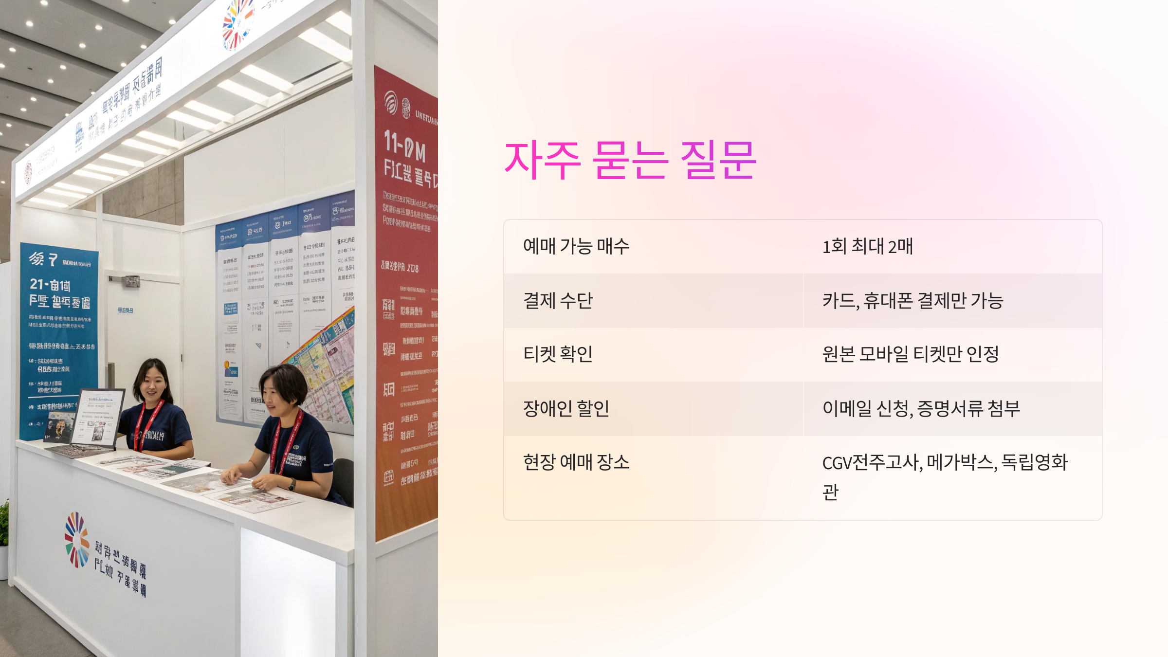 현장 매표소는 CGV전주고사, 메가박스 전주객사, 전주디지털독립영화관 등에 마련되어 있어요. 매표소 운영 시간은 영화 상영 시작 1~2시간 전부터 운영되며, 영화제 전 기간 동안 관객들을 맞이할 준비가 되어 있답니다.