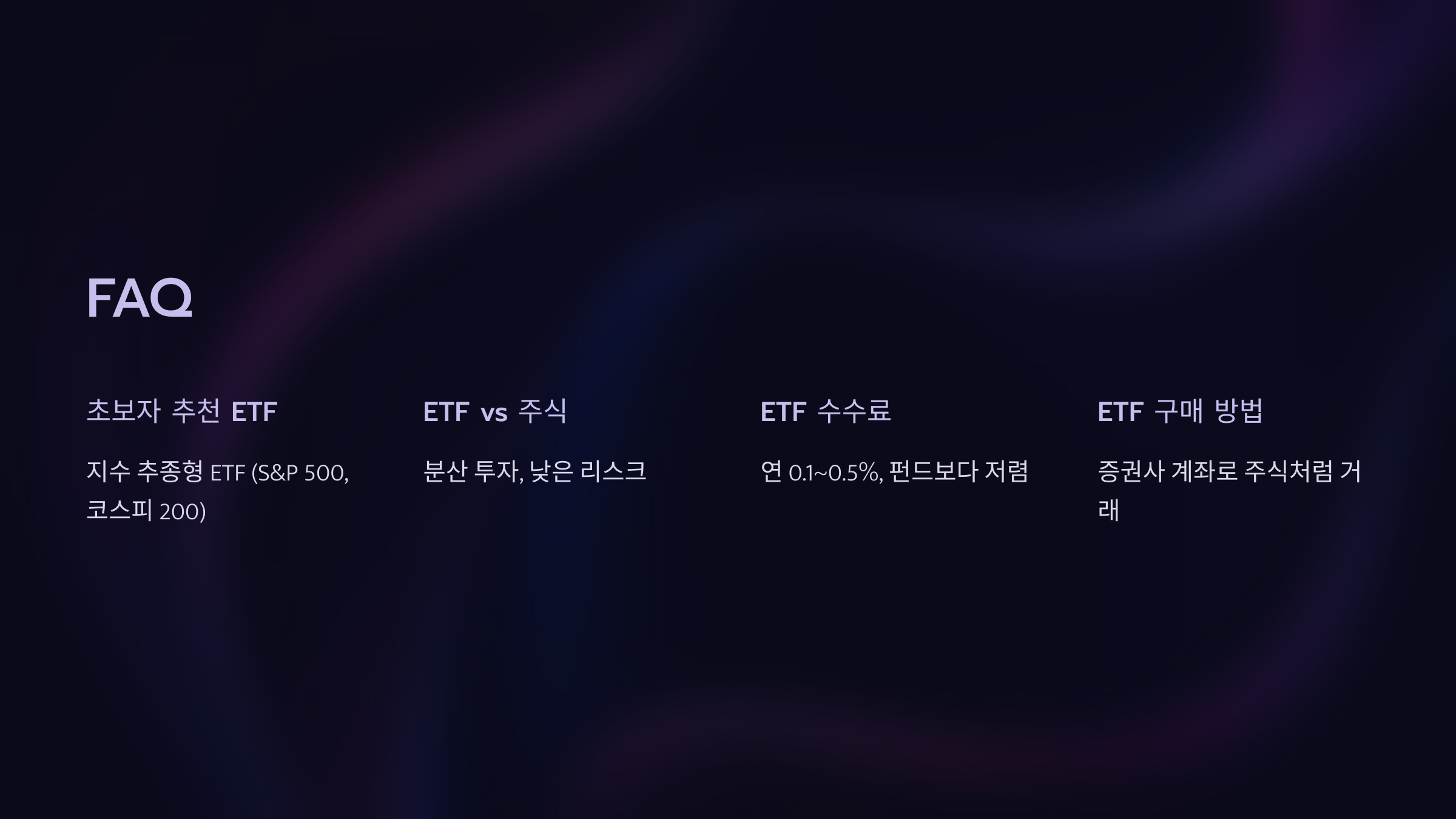 A3. ETF의 수수료는 펀드보다 낮은 편이에요. 보통 연간 0.1~0.5% 수준으로, 장기 투자를 고려할 때 매우 경제적이에요.